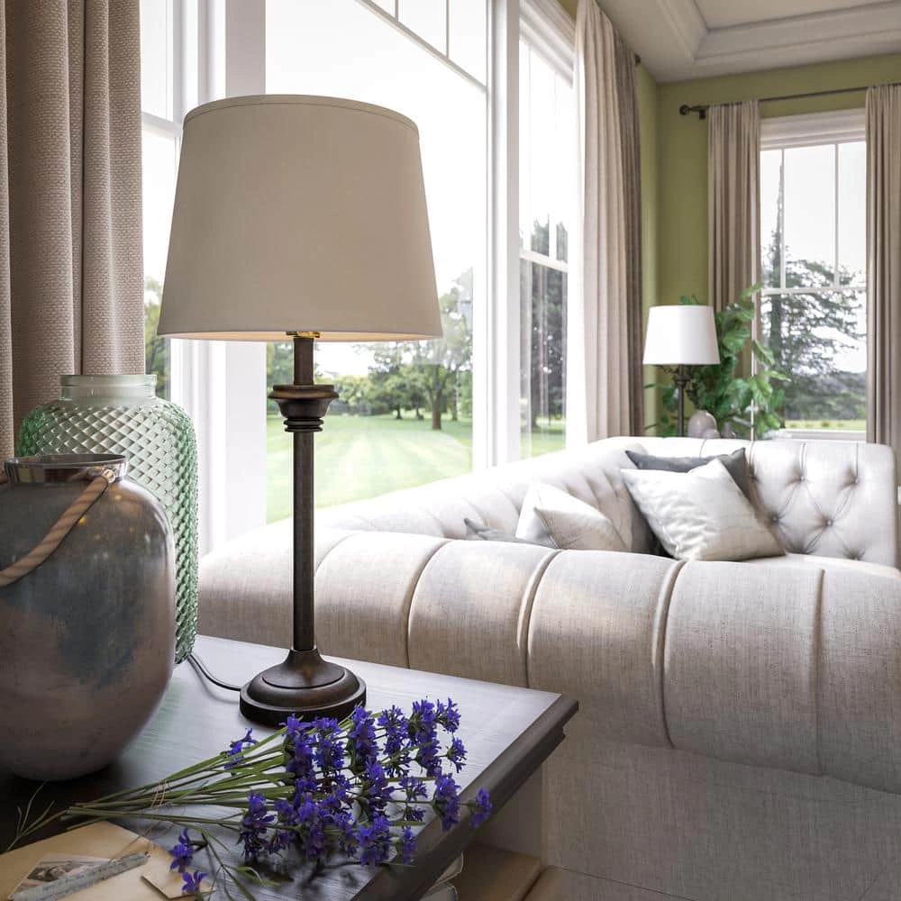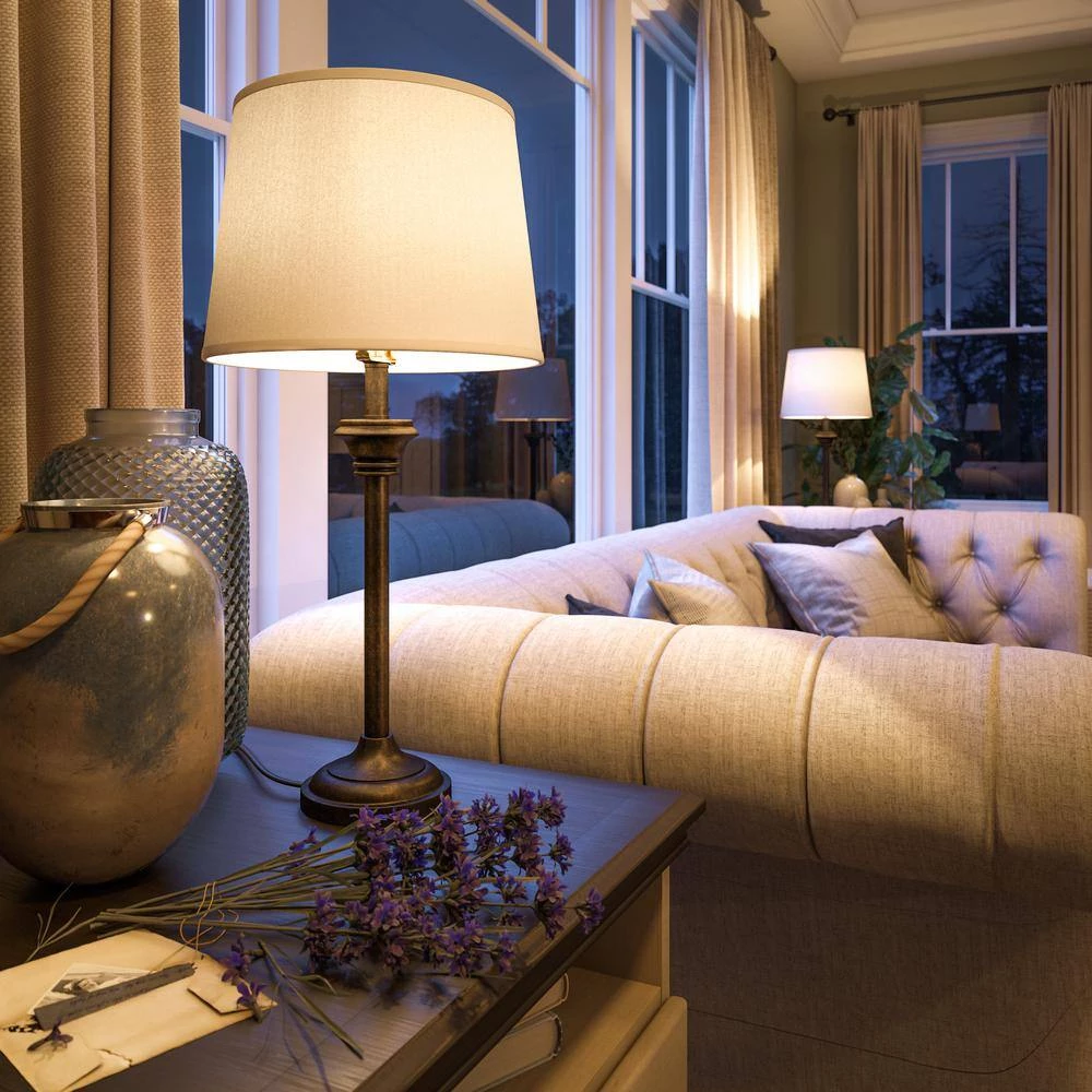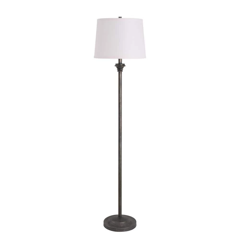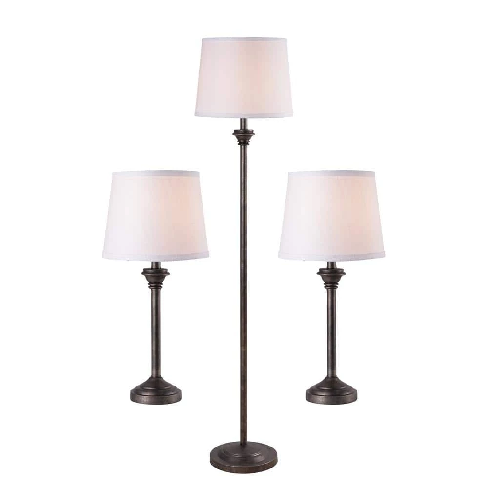 With its matching table lamps and floor lamp, this 3 piece lamp set brings plenty of casual style to your living room while filling your home with bright illumination. This collection on lamps features a clean profile thanks to its sleek lines. The base of the lamps are circular, featuring a soft stacked detail that leads to a minimalist support rod. Just below the white fabric shade that casts plenty of bright light across your space is an accent that adds a slight traditional touch to the lamp. The white shade pairs with the vintage metal finish of the body for a complementary look, making it perfect to place in a neutral or dark-toned casual living space. The table lamps will be right at home alongside your comfy couch while the floor lamp is perfect to help brighten up a reading corner. Place all lamps together or place in different rooms for a cohesive look.
