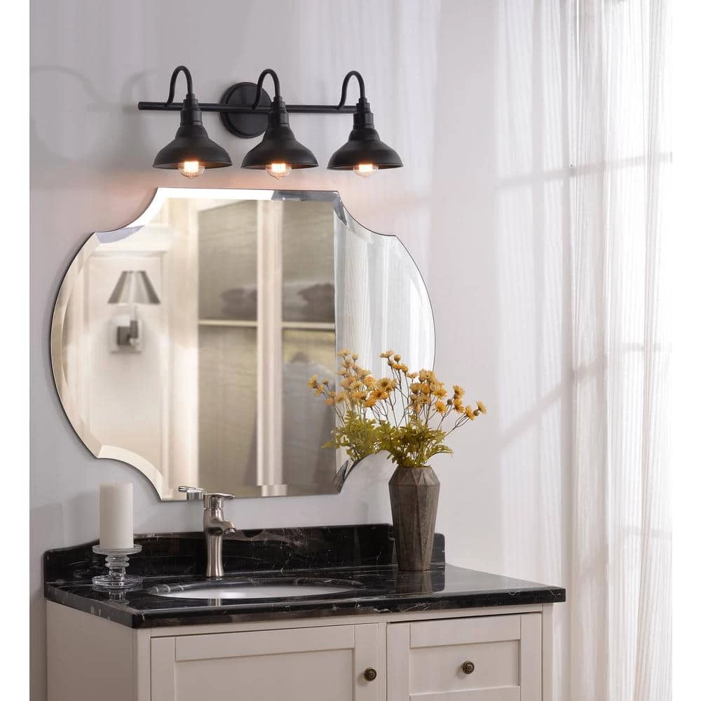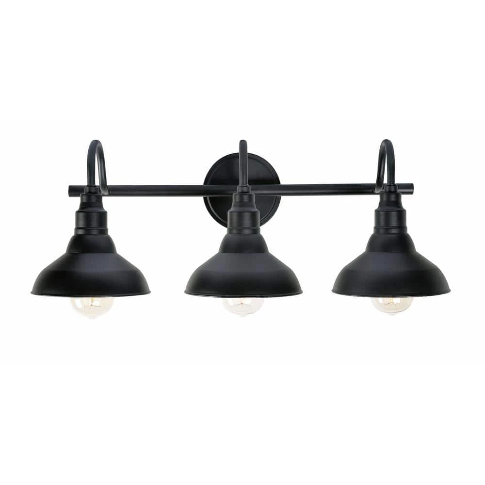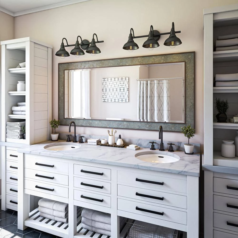 Bring your casual and cozy farmhouse design style to your master bathroom. With a sleek black finish, this 3-light vanity exudes plenty of country charm with the open barn style metal shades, allowing for plenty of downlighting for touching up makeup. For even more vintage charm, use a compatible Edison bulb to take advantage of the exposed bulb profile of these farmhouse shades.