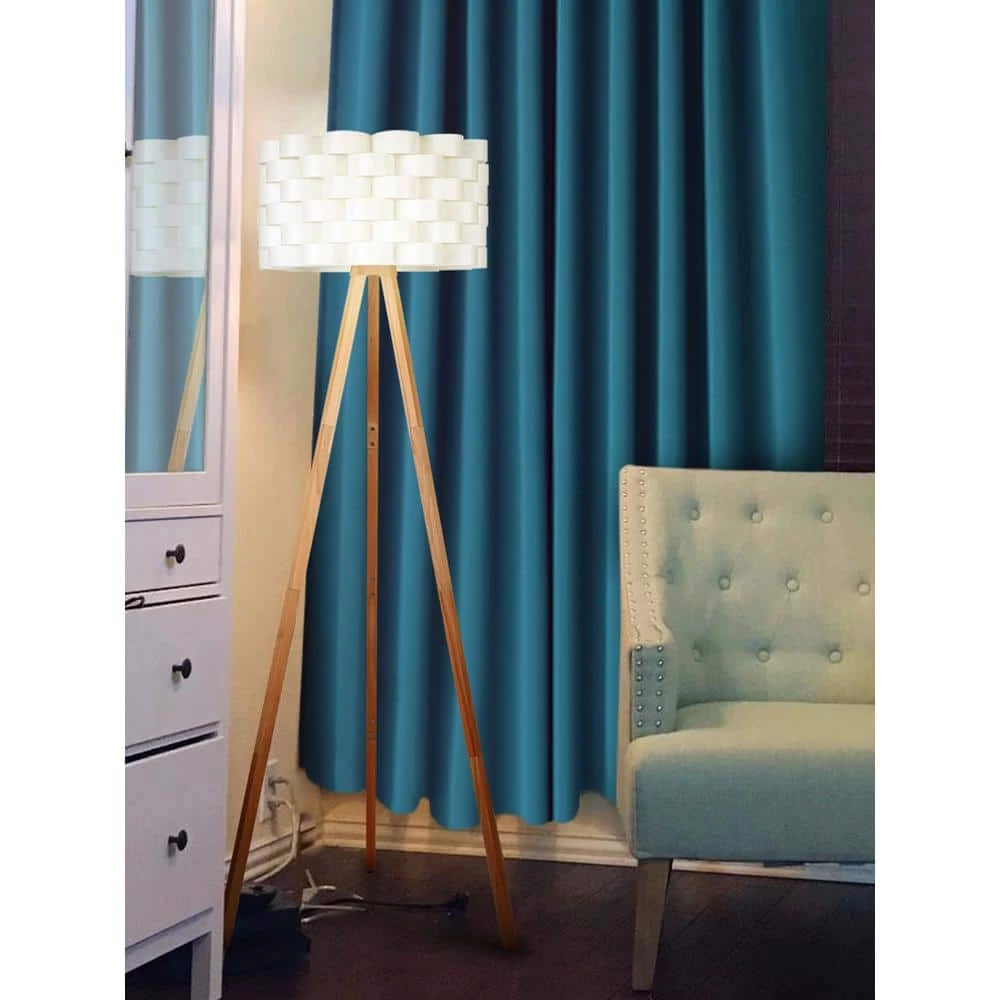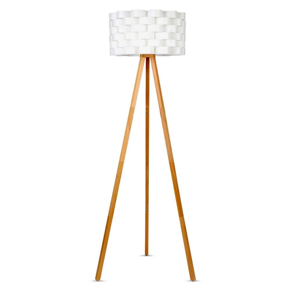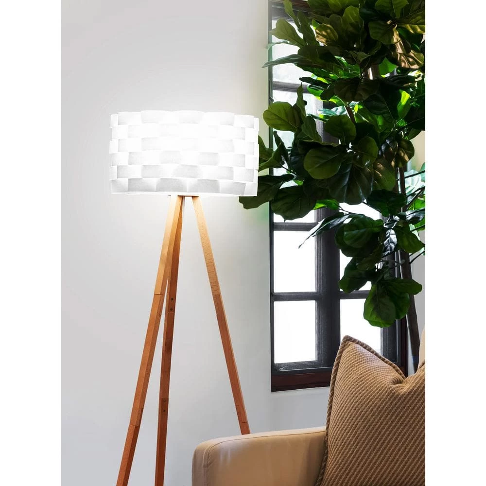 - The 10-inch cylindrical lampshade’s unique weave of wide interlacing ribbons beautifully complements the natural wood tripod base.