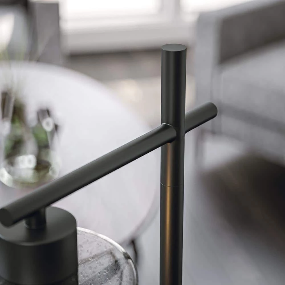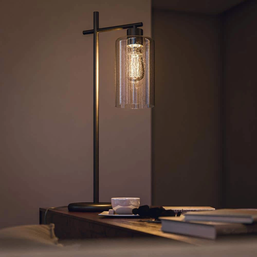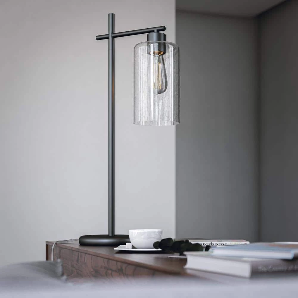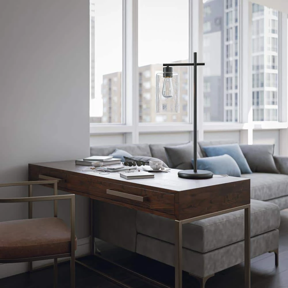 This tall desk lamp delivers minimalist style and bright lighting to your urban contemporary home office. There is elegance in the simple form of this lamp, further enhanced by the quality graphite finish and clean lined profile. A crystal clear glass shade allows the light to flow freely from the included LED Edison bulb, making this desk lamp perfect for reading or for use as a task light late into the night. A convenient line switch allows you to easily operate you lamp, also keeping any unsightly socket switches from cluttering the simple design.