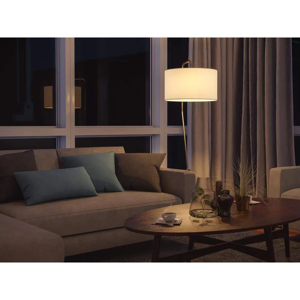 - Contemporary crisp white drum shade creates bright, room-filling illumination