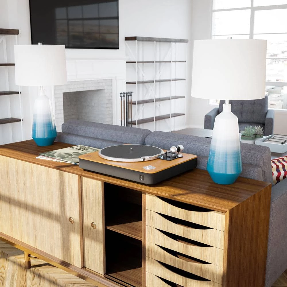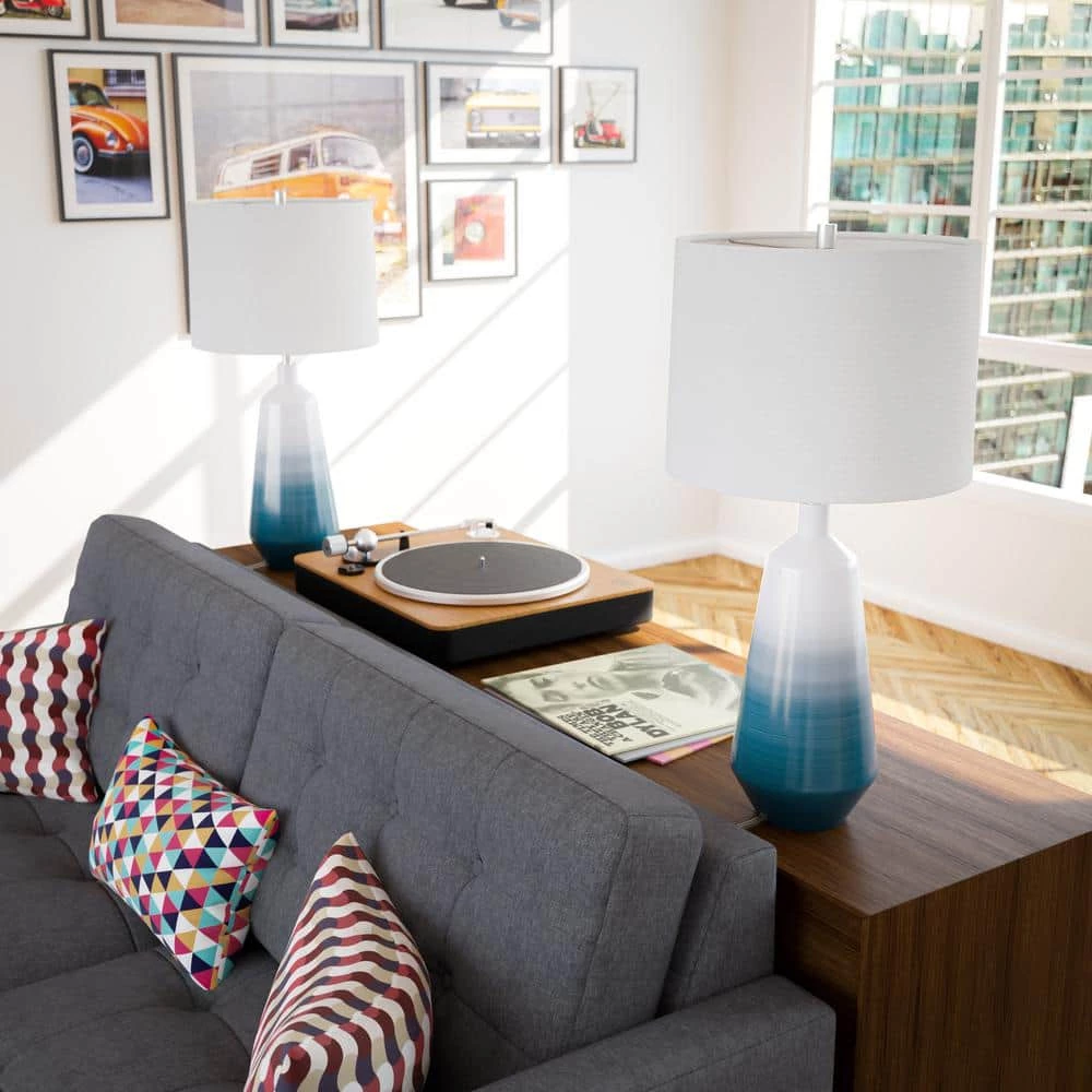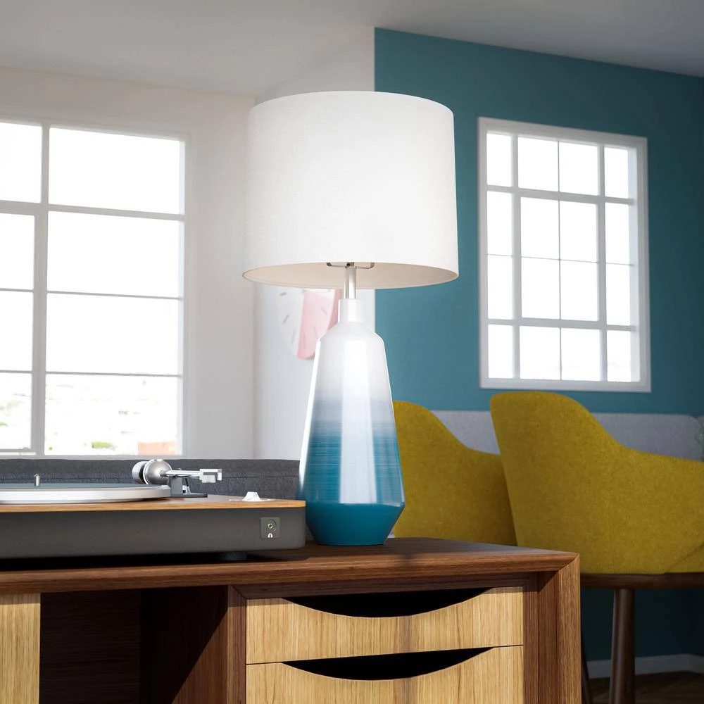 Coming in a sky blue ombre ceramic finish, the body of the lamp features soft lines that pair with a contemporary tapered profile. The complementary colors make this perfect to place in a modern living room, flanking a white or light-toned couch on side tables to add a pop of bright blue color. Bright light will illuminate your space thanks to the white linen shade and 3-Way Adjustable Lighting.