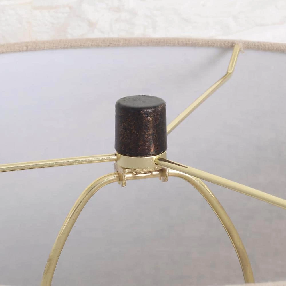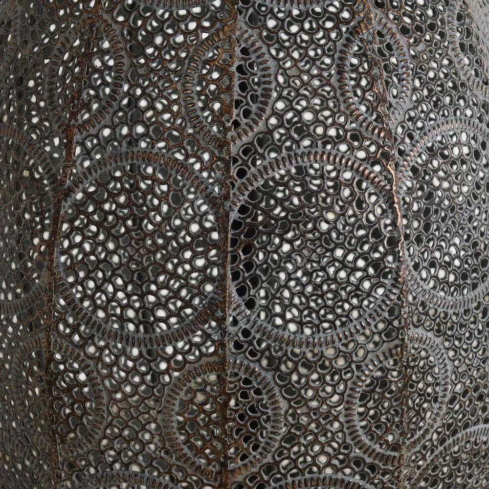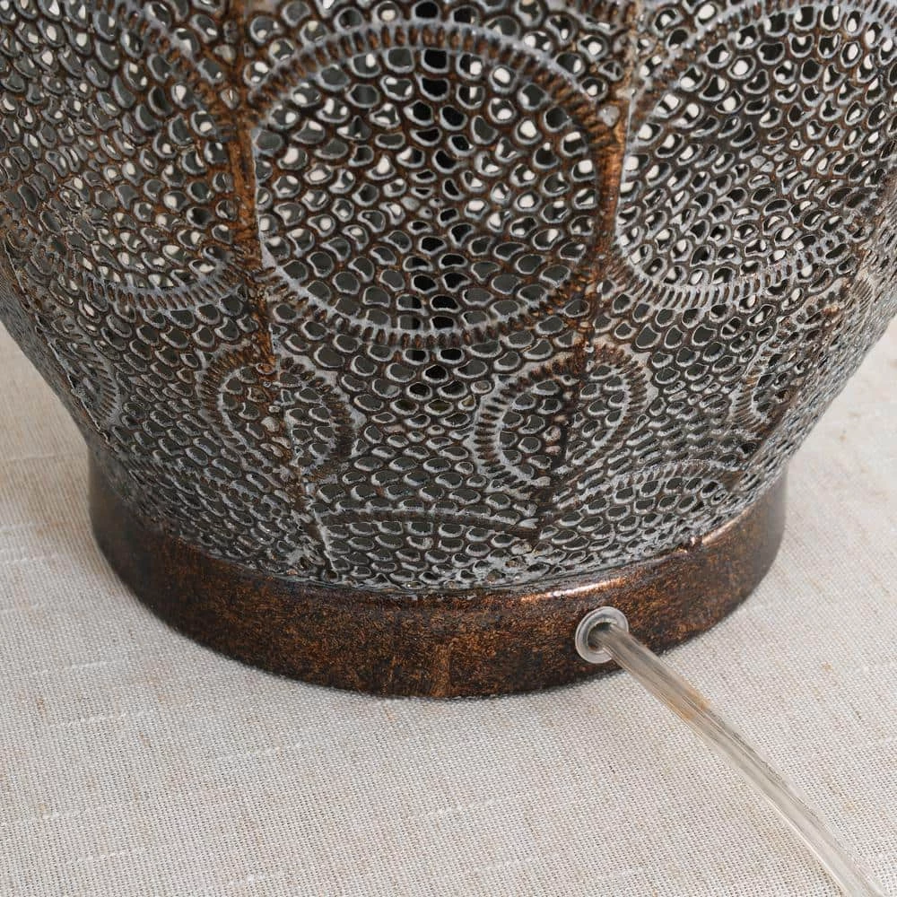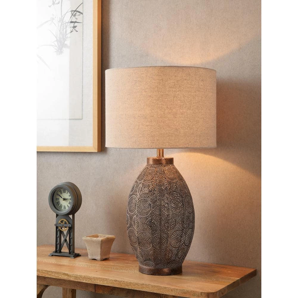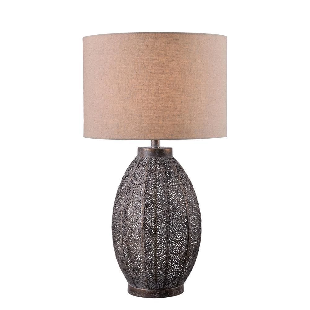 With a classy aged bronze finish, this Moroccan-inspired table lamp with its open cut metal pattern body is a sophisticated take on the modern metallic luxe look. The toned-down, weathered finish gives a subtle metallic vibe on top of your nightstands, catching the light escaping from the drum shade. The beige fabric adds a soft touch to the metallic lamp body bringing out the warm neutral tones in the mixed materials found in your natural modern living room. Made effortlessly functional with 3-Way Adjustable Lighting, this table lamp is the perfect casual finishing touch for your bohemian, rustic, or modern home.