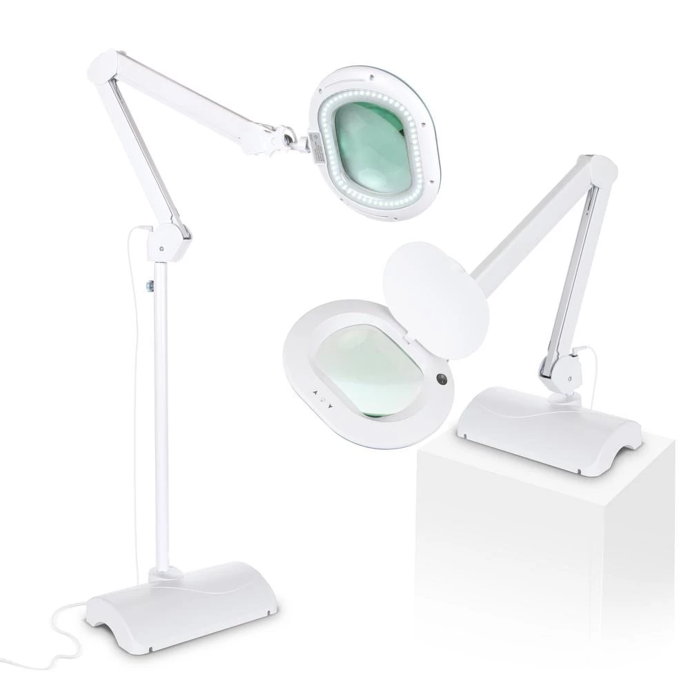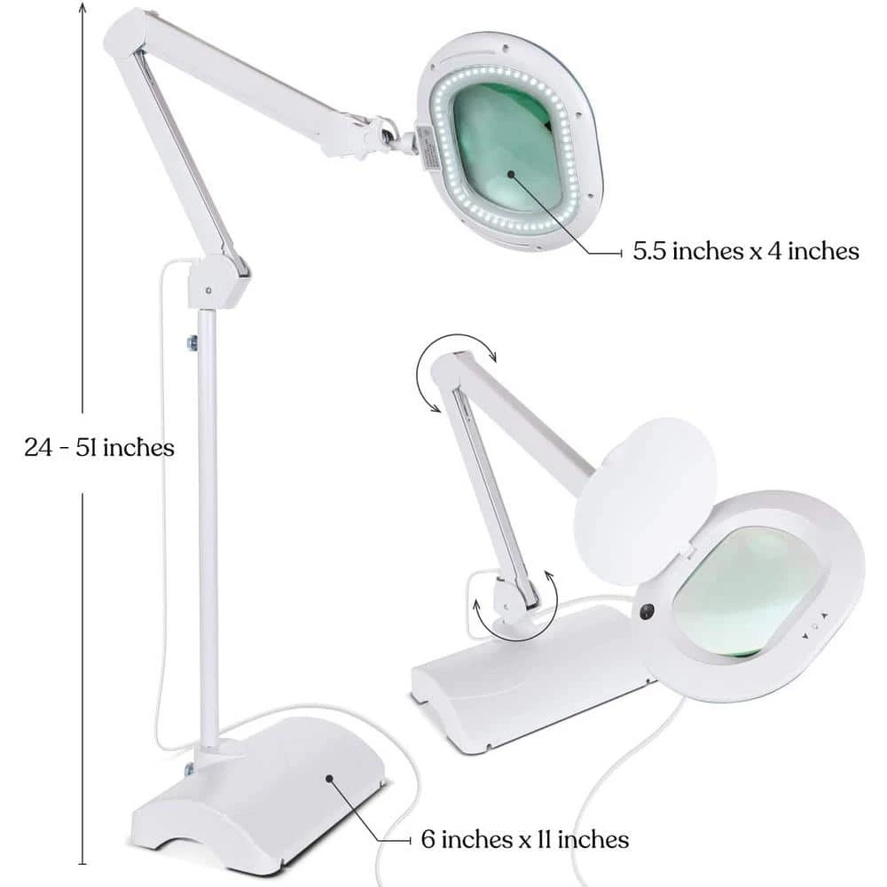 - The lens magnifies 225% and provides light without glare. It sits 6″ in diameter, 4.5″ long, and 1″ thick. The lamp also features a sturdy weighted base that measures 6 x 11″.
