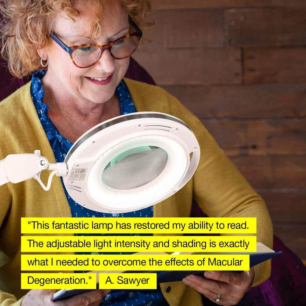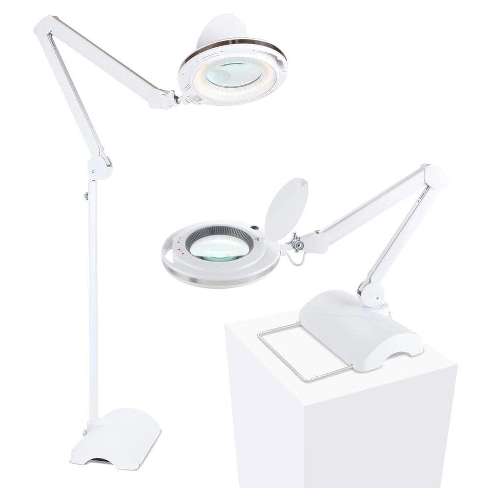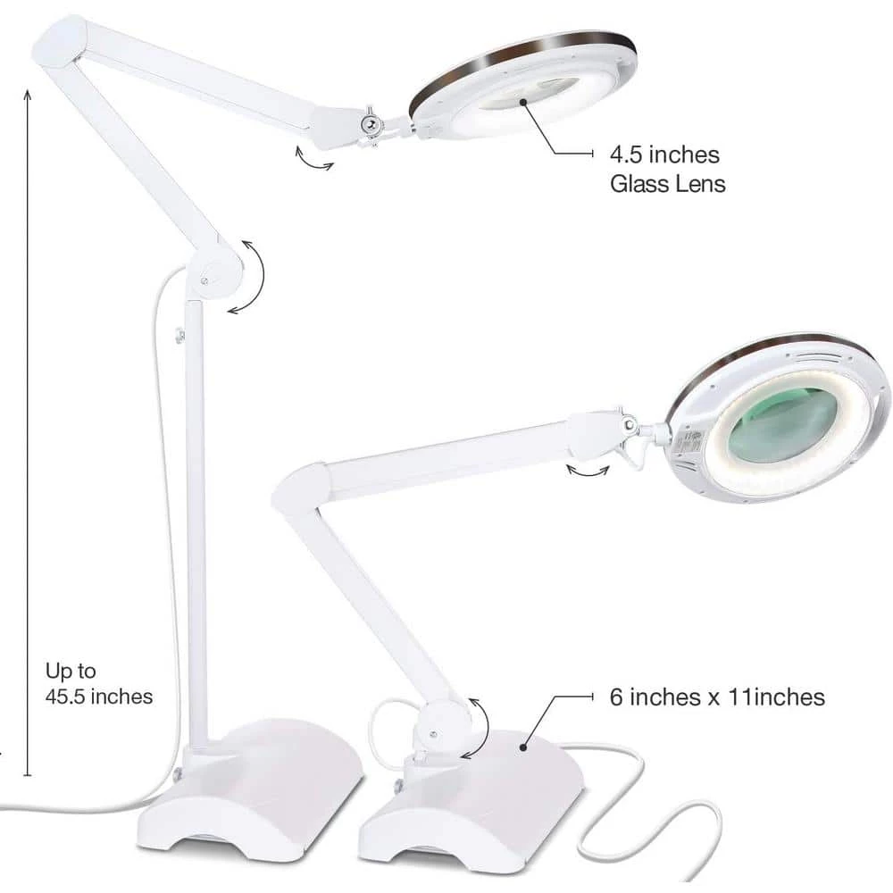 - The removable lens magnifies 175% and provides light without glare. It sits 4.5″ in diameter and is 1″ thick. The lamp also features a sturdy weighted base that measures 6 x 11″.