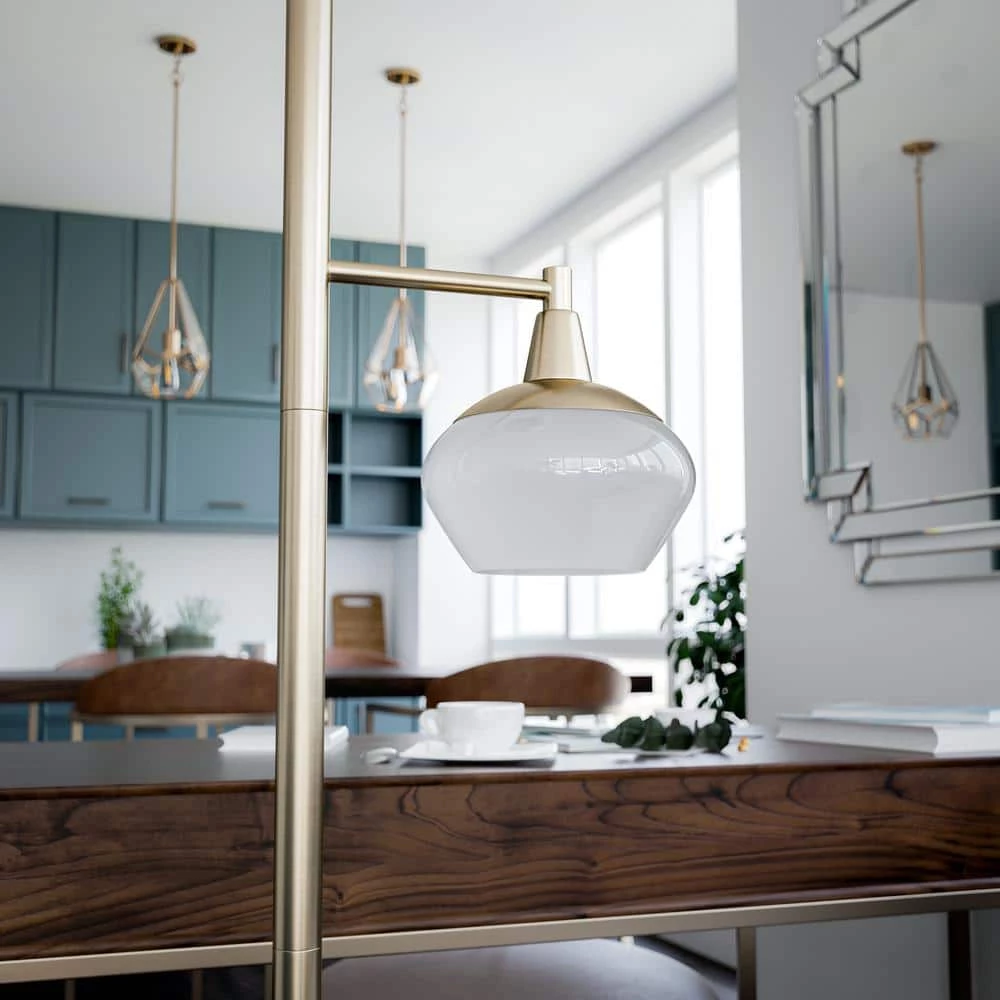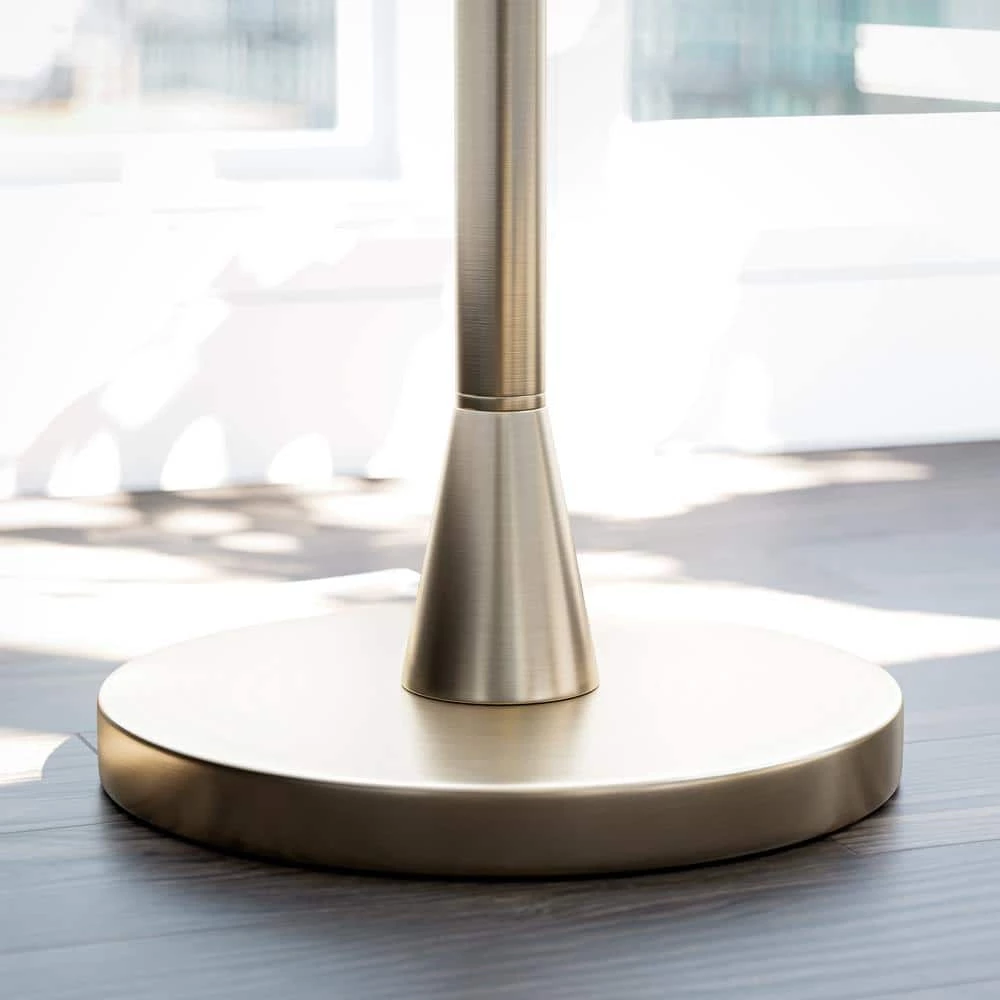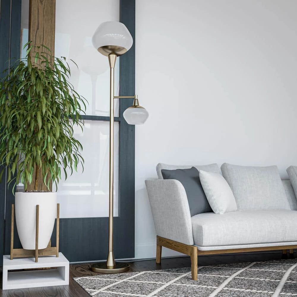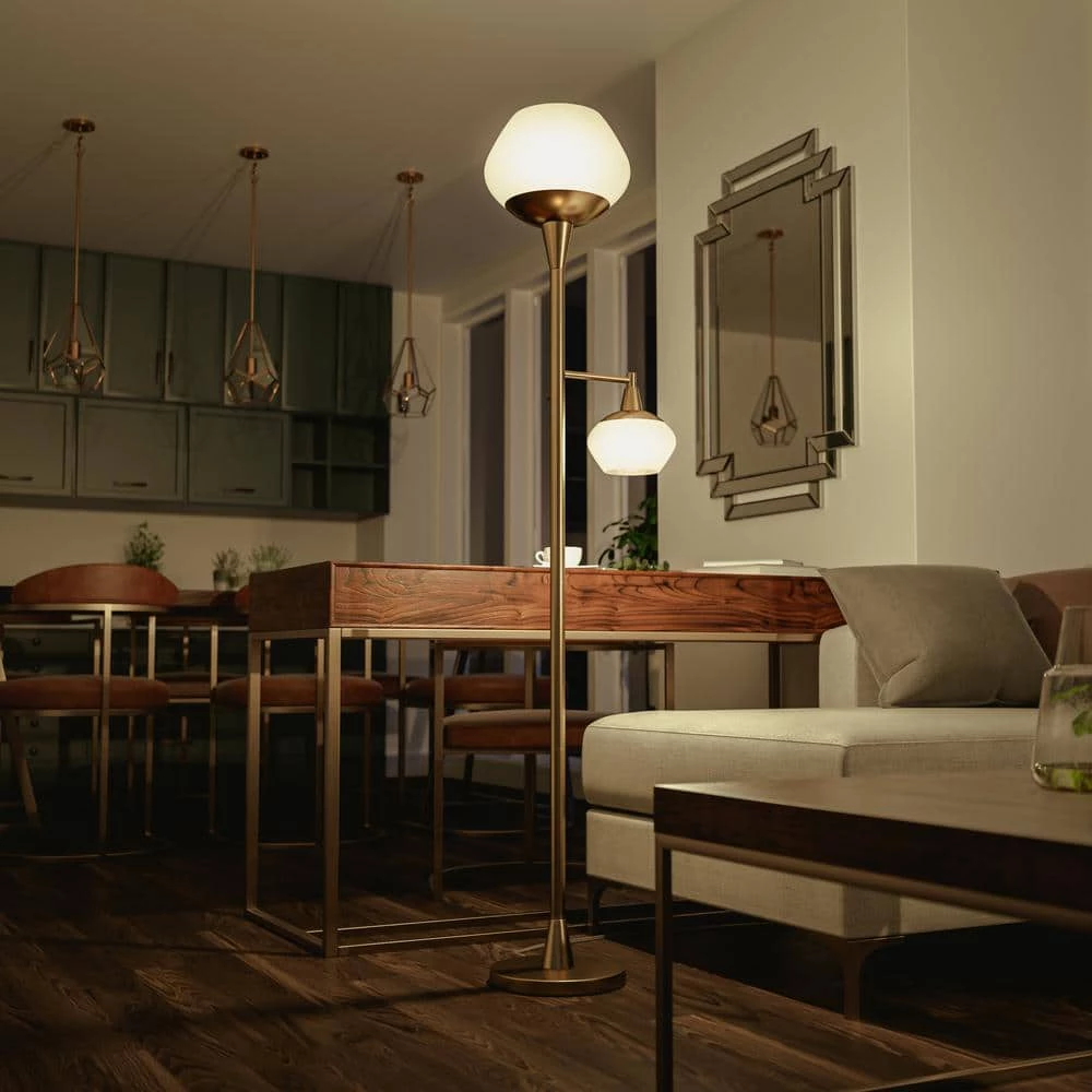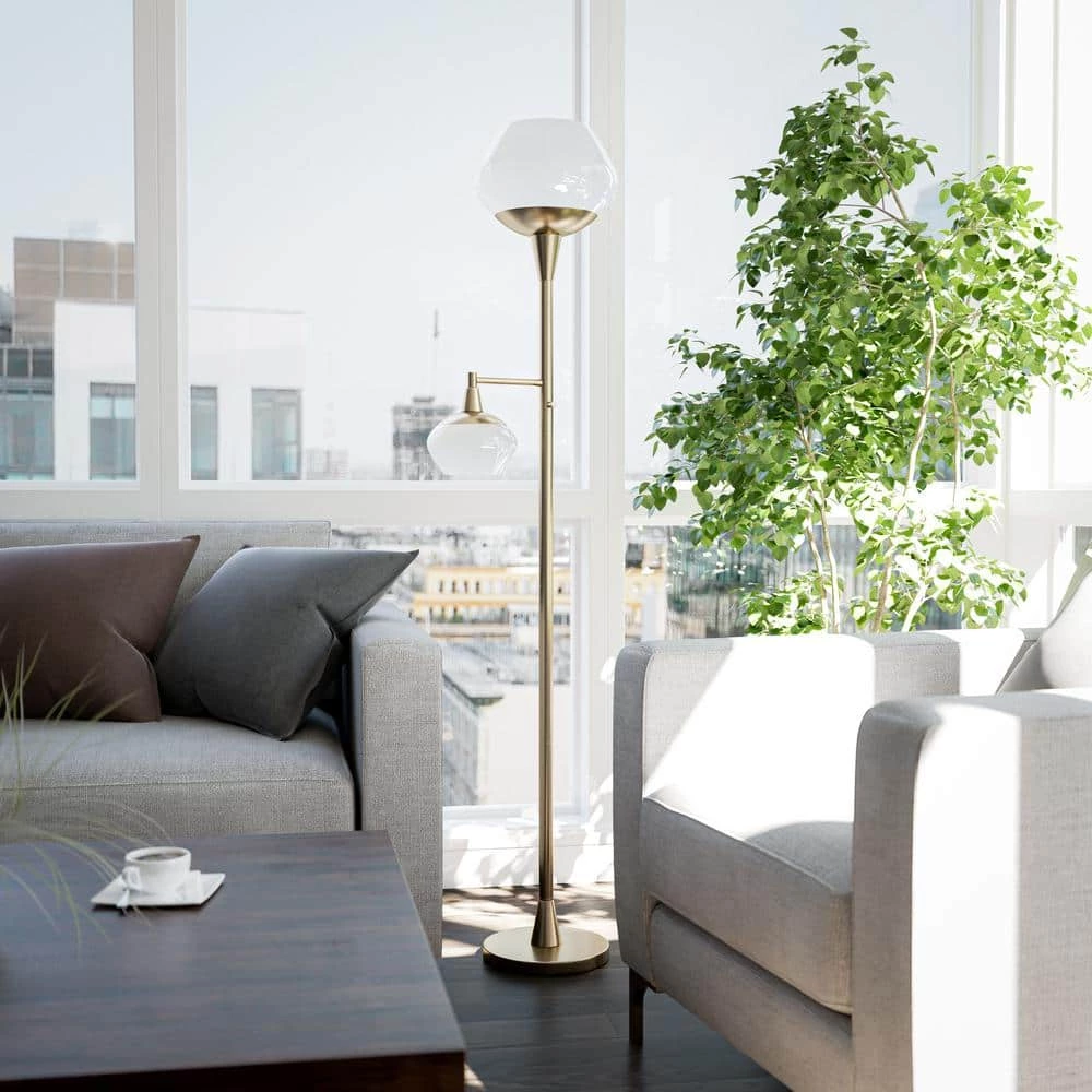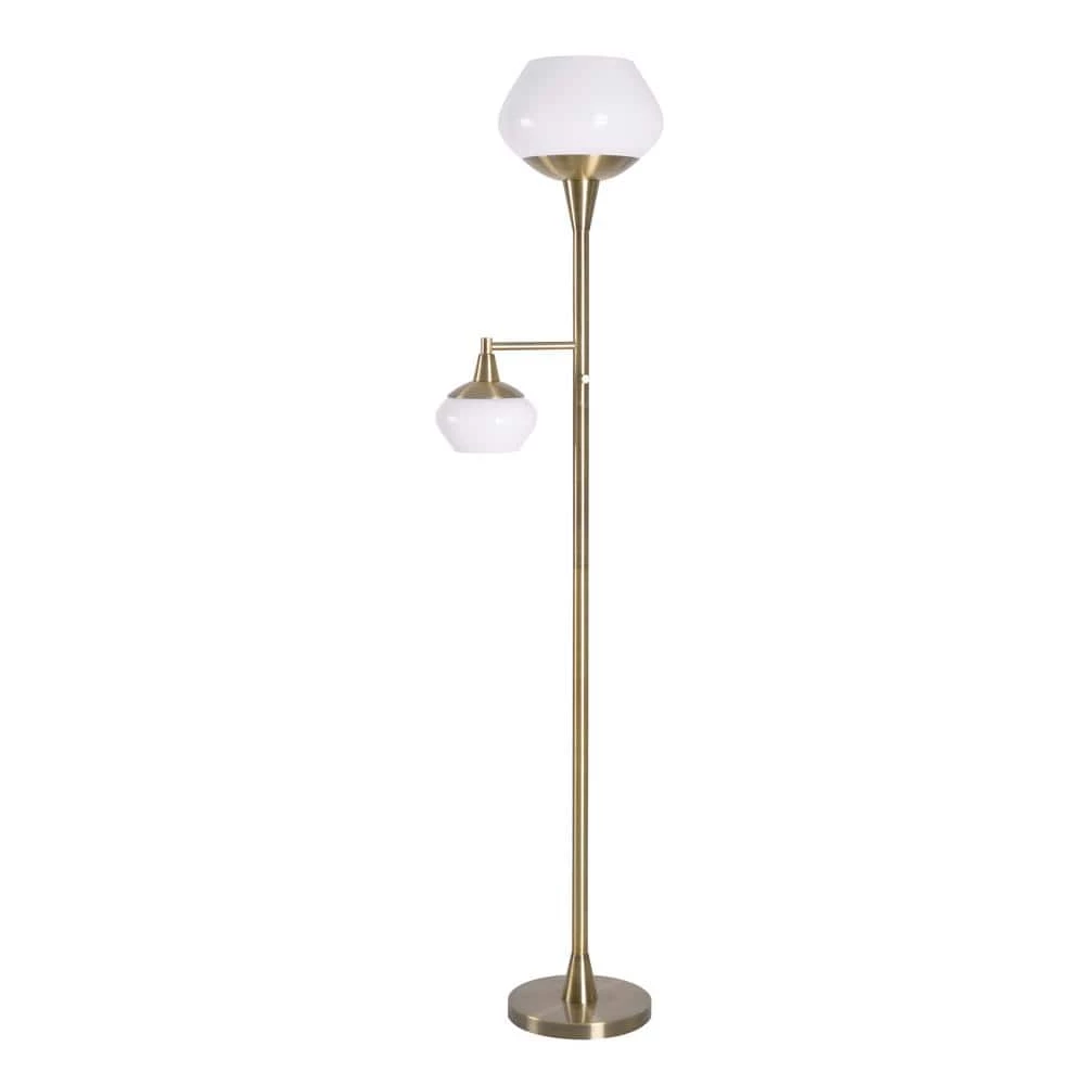 Smooth lines and a strong Mid Century Modern vibe adds sleek retro industrial style to your throwback nostalgic contemporary living room. A rich antique brass finish complements the tall mother and son torchiere floor lamp. A bonus side arm light, with the same frosted white opal glass shade as the main light, serves as excellent task lighting for reading, working from home, or just relaxing.