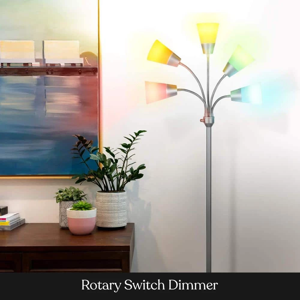 - Built-in rotary switch controls dimming for mood or accent lighting- the 3 settings are 2 heads on, 3 heads on, and 5 heads on, choose between a white or multi-color shade set or any mixed variation of the 2 for styles that fit any space