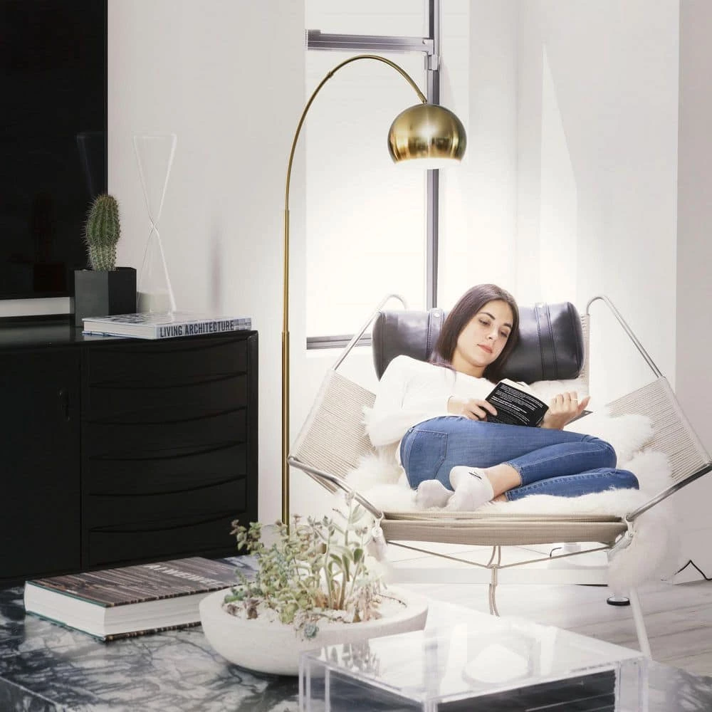 - Contemporary Arc Floor Lamp: The Brightech Olivia standing lamp comes with a 9″ globe (aka “dome”) shade made from metal and a trendy golden hue; this design works excellent with industrial, mid-century modern, and modern decoration themes. This arc-and-globe lamp shade and brass finish will elevate the level of elegance in your office and home, and your guests will not stop talking about it once they see it.