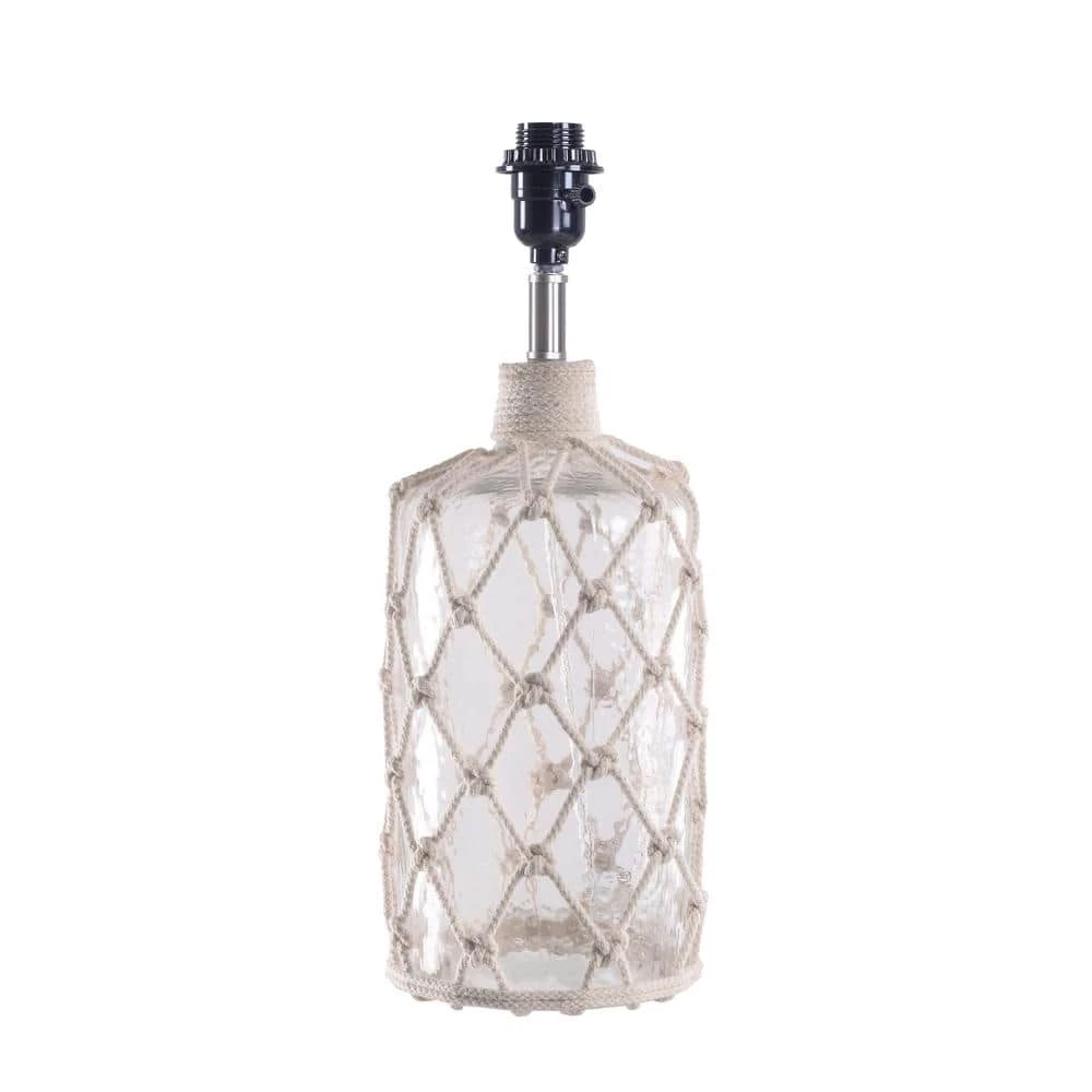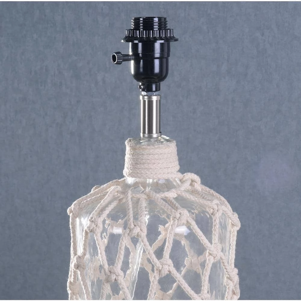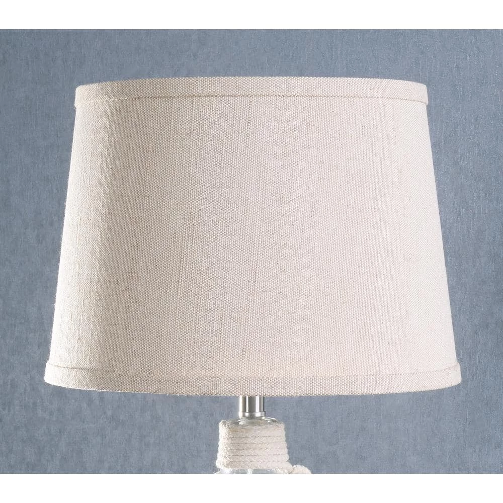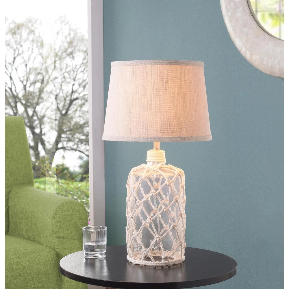 Style be lurking ahead mateys. This coastal-inspired accent lamp has a rustic glass lamp body woven in natural rope perfect for your coastal living room or captain’s quarters. The thick cream textured shade basks your weathered nightstands in a warm, inviting light. Place in your nautical bedroom for a light, airy look for your beach cottage.