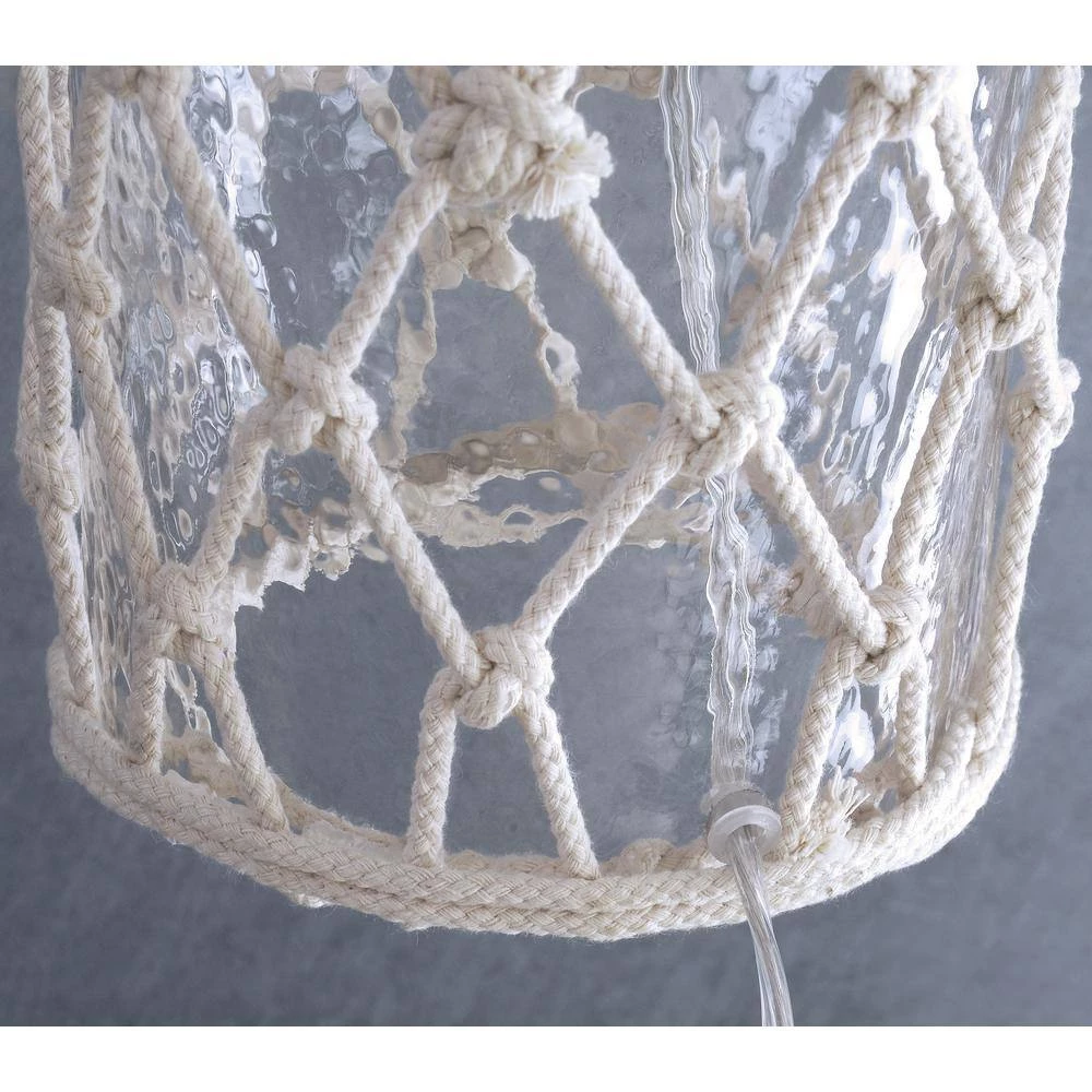 - Clear glass body and natural rope accents