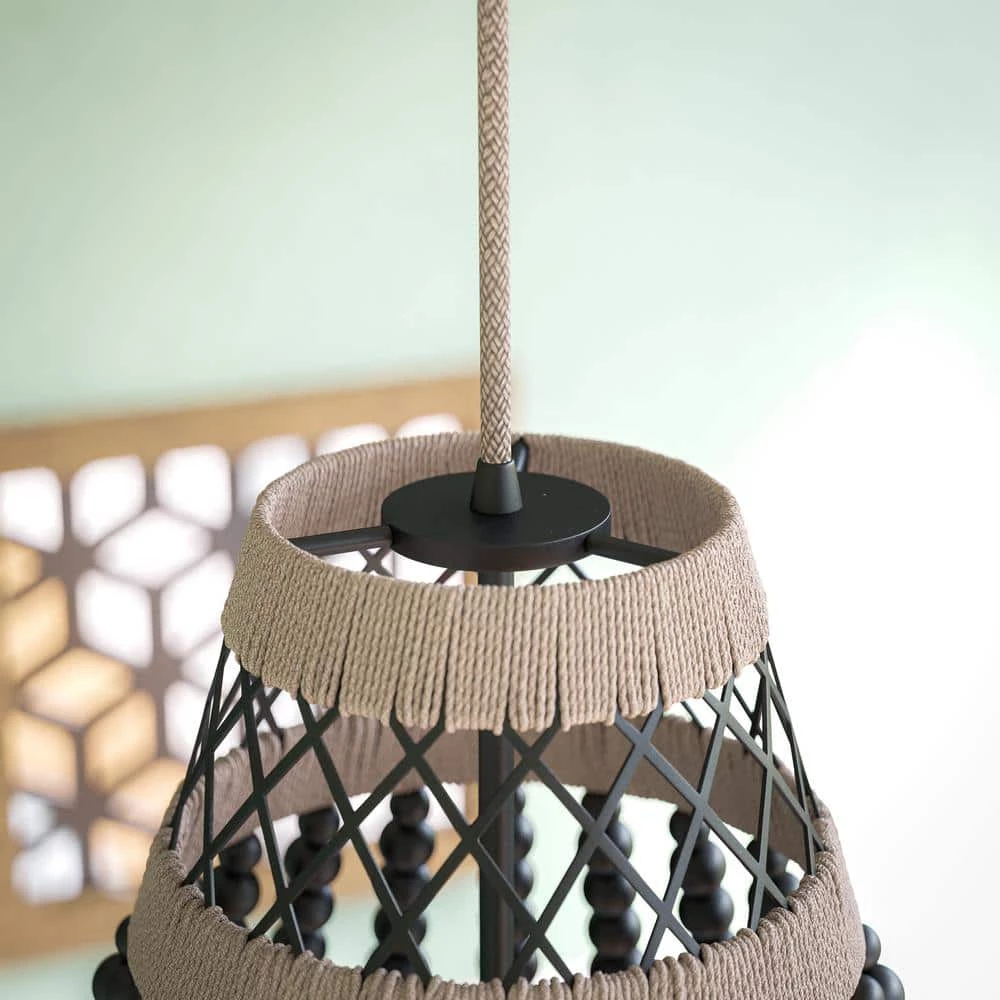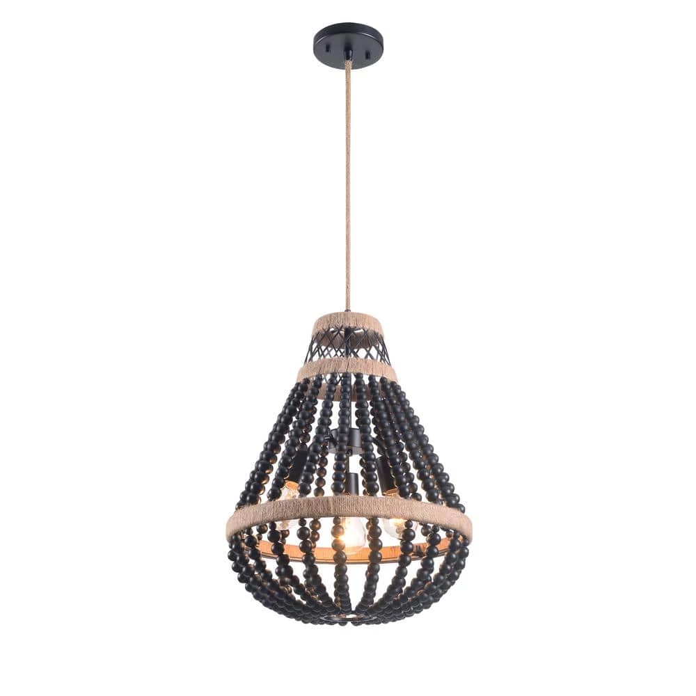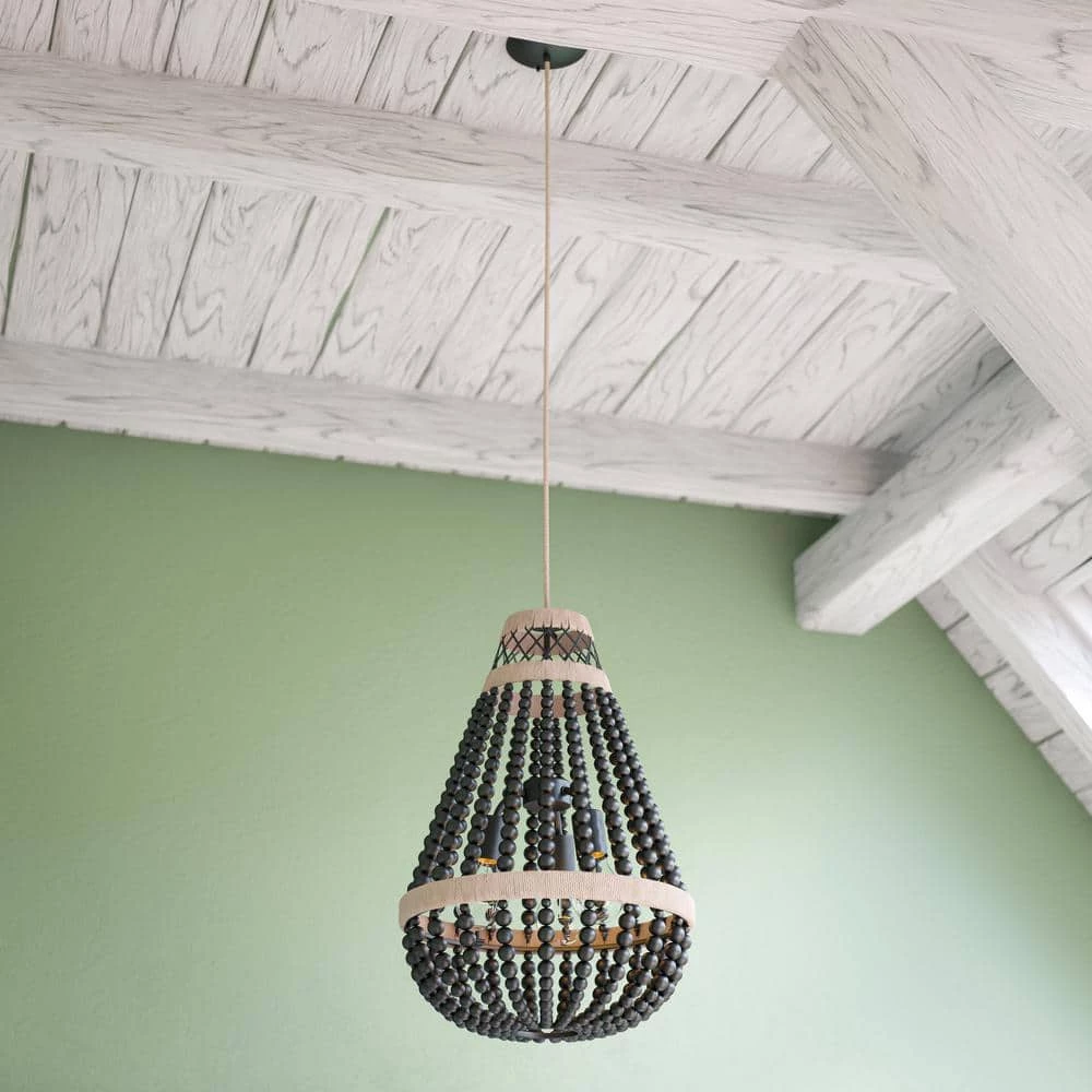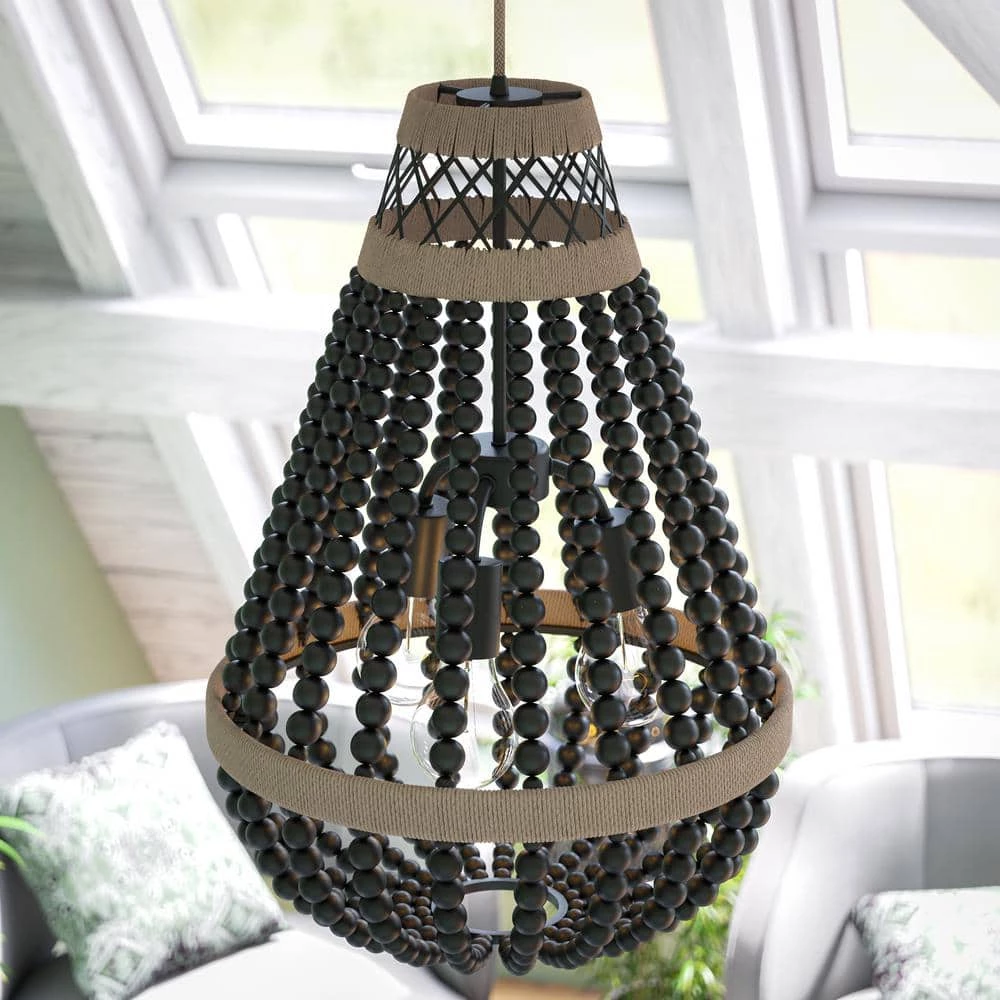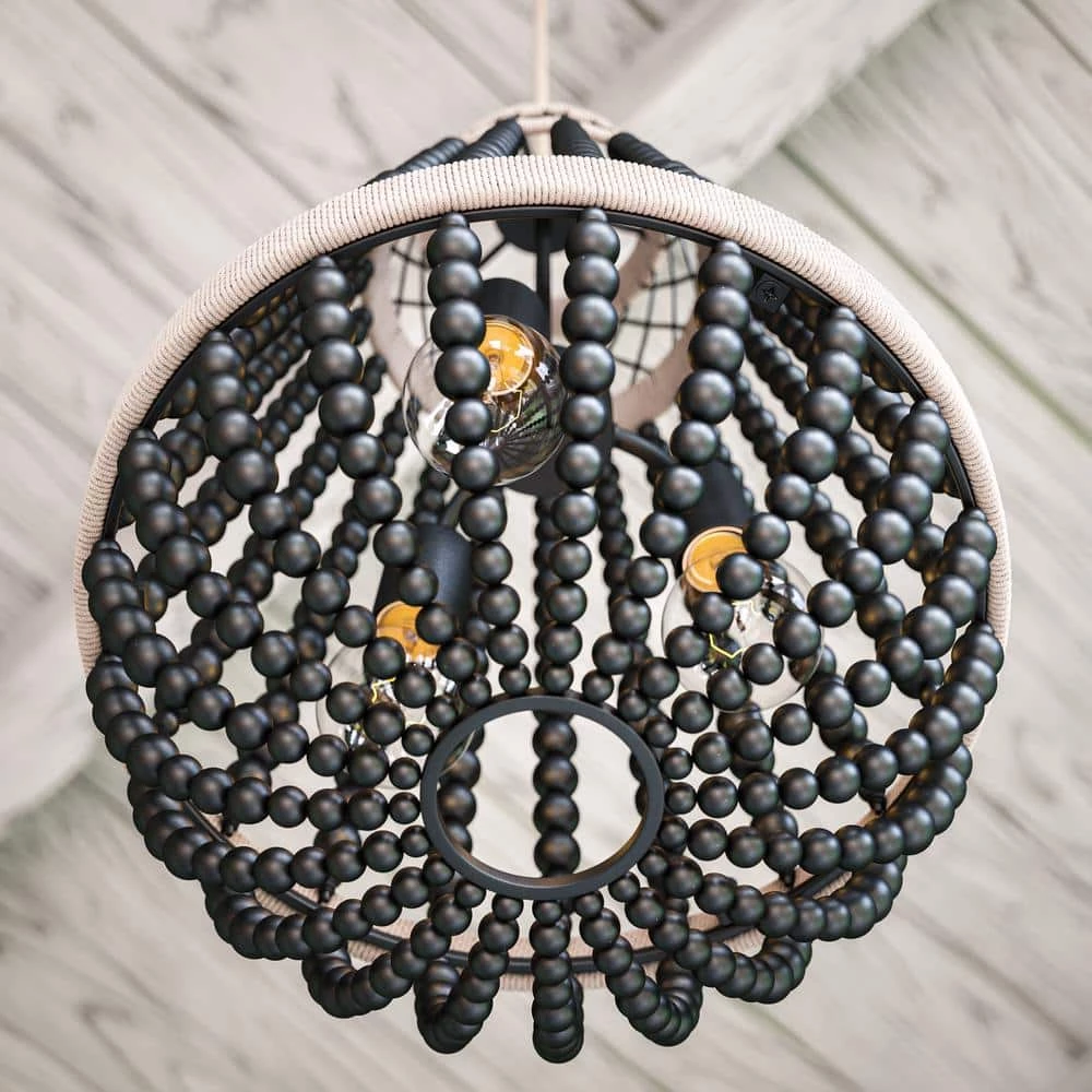 Contemporary meets boho with this 3 light pendant. Smooth black wood beads contrast with real rope detailing in this beaded chandelier. Vaulted and sloped ceiling compatible, hang this pendant light in dining rooms, kitchens or entryways.