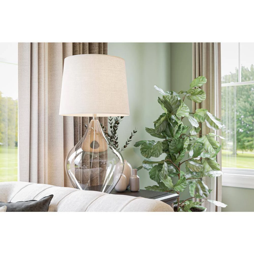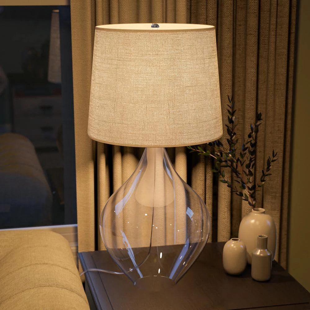 Crystal clear hand blown glass, light cream colored shade – this table lamp serves plenty of bright accent lighting with a versatile design to boot. The clear glass body seamlessly melds into your existing home decor, while the curvy, unique profile adds casual charm. The cotton linen tapered shade sheds plenty of warm lighting in your minimalist living room, cottage chic master bedroom, or modern home office.