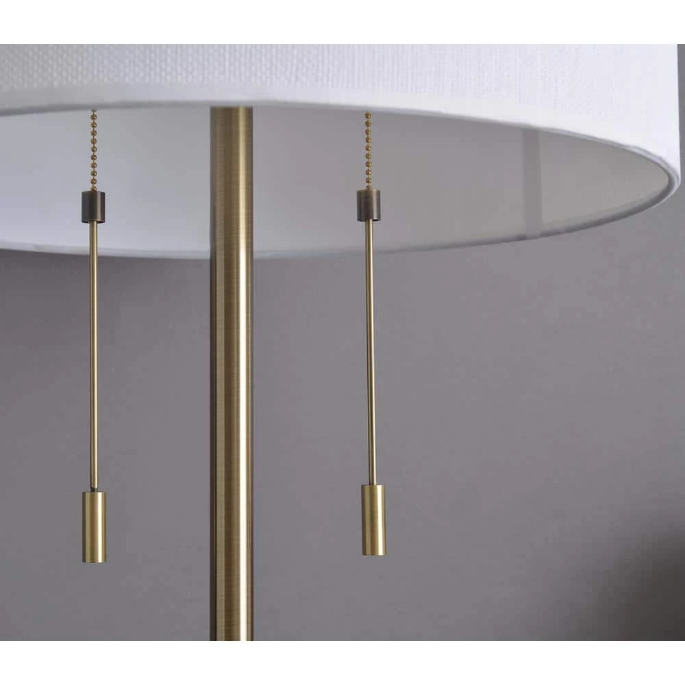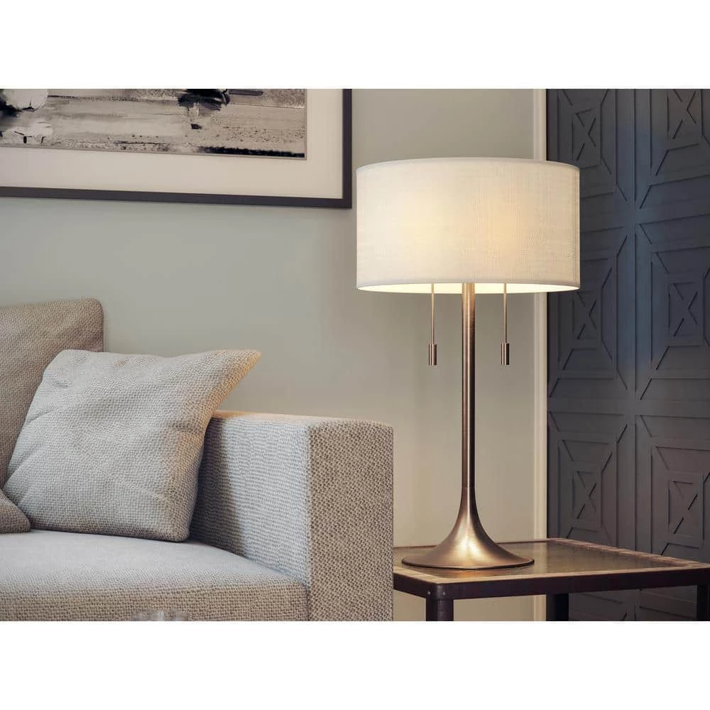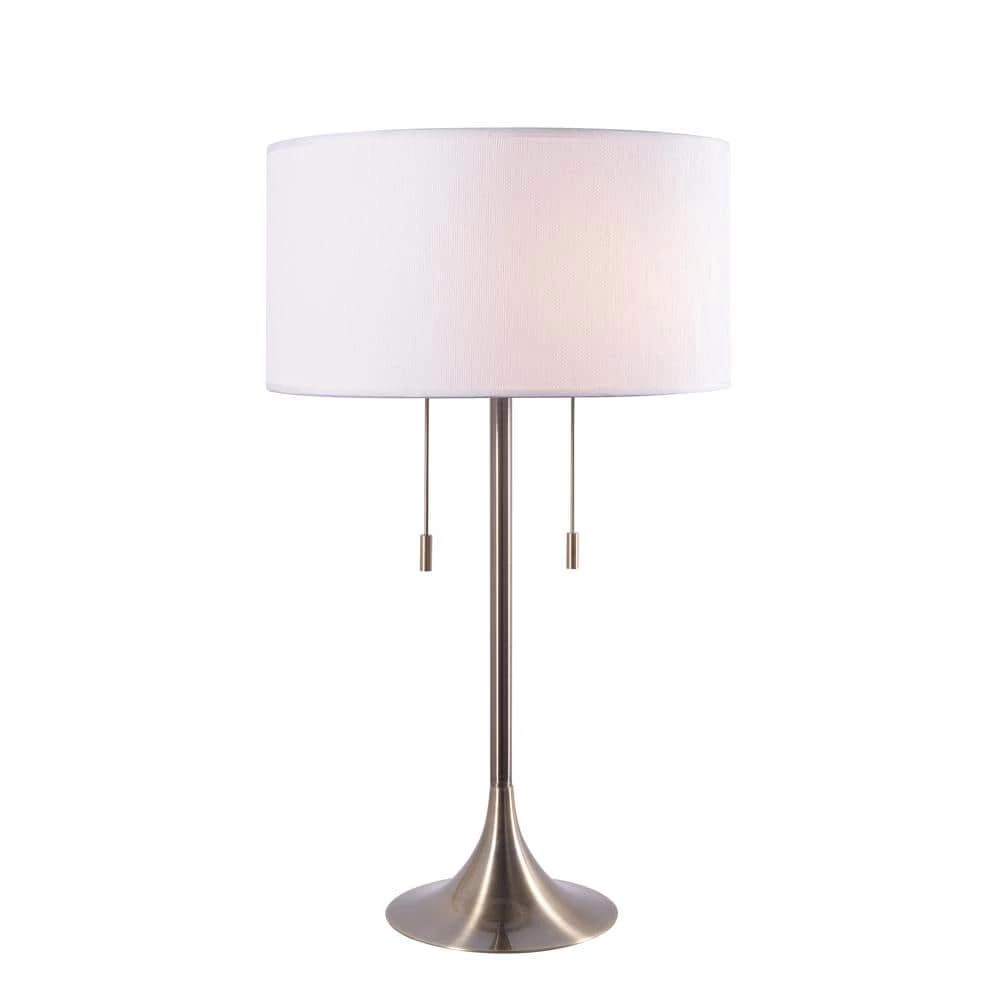Add a touch of contemporary elegance to your living space with the Stowe collection. Simple and chic, the fast clean lines of this lamp family shimmer and shine courtesy of the lustrous antique brass finish. Featuring dual pull chains, the Stowe family can easily transition from an ambient accent to a room filling illumination source. Ideal for a living room end table, nightstand or desk, the 30 in. tall Stowe Table lamp has a sturdy base that funnels up to the lamp body like animated mercury. Each lamp in the Stowe collection is outfitted with a crisp white textured drum shade, the perfect complement to accent top off modern and contemporary appeal of this collection.
