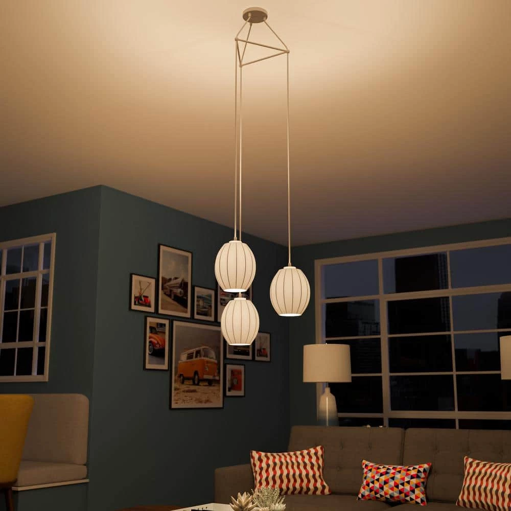 A cluster pendant stylish enough to walk the catwalk, this high fashion-inspired 3 light cluster pendant is here to illuminate your contemporary entryway or glam dining room. 3 seamless white silk shades hang from a geometric triangular matte white frame, giving your modern living space a light and airy look while giving the whole area a warm, welcoming glow. Easy to install, all hardware and easy to follow instructions are included in the box.