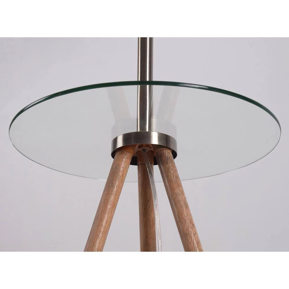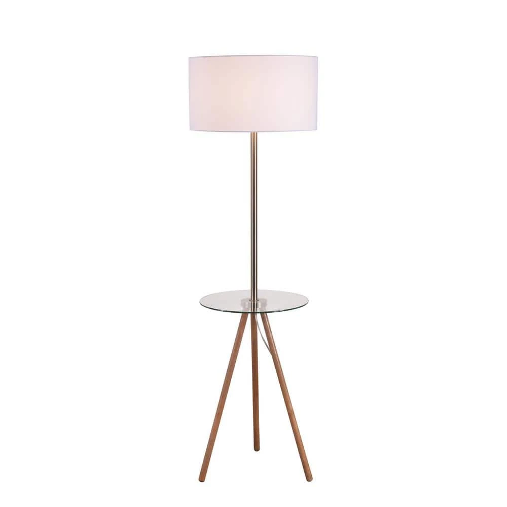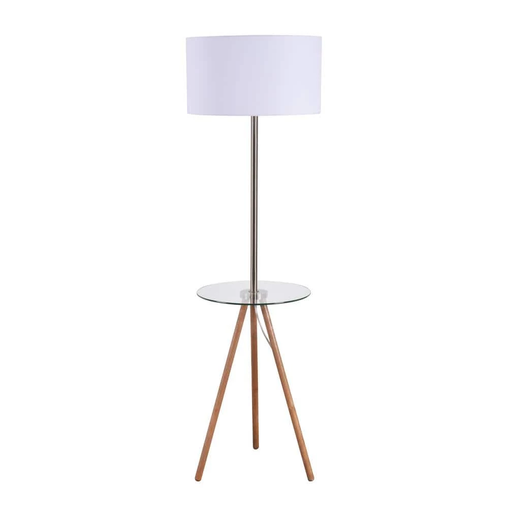Contemporary clean-lines and functional 2-in-1 style give this multi-functional floor lamp its unique profile. A tripod base, composed of luxe antique brass-finished metal or naturally finished wood, supports a small tempered glass tray that’s the perfect size for displaying small treasures or for holding a nice warm cup of coffee, combining an end table with lighting for the ultimate multi-use home accent. This tall 61 in. floor lamp is crowned with a crisp white drum shade that diffuses bright light for a gentle, room-filling glow perfect for use in between 2 Mid Century Modern accent chairs to illuminate conversations or for use as a reading light. With 3 different light levels to choose from, you’re sure to find the perfect light level for any time of day in your mixed material natural modern living room or your contemporary glam master bedroom.